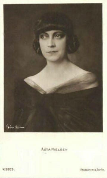 A few years ago, when pictures made in Europe were common on the American screens, Asta Nielsen's abilities as a vampire and comedy lead were recognized by most patrons. She has appeared in Nordisk and other Continental brands and is of the black-haired, black-eyed type and rather slender. A story is told of a patron new to pictures who asked, «Who is that holding a stick up in front of the screen?» «That isn't any stick», he was admonished, «that's Asta Nielsen».