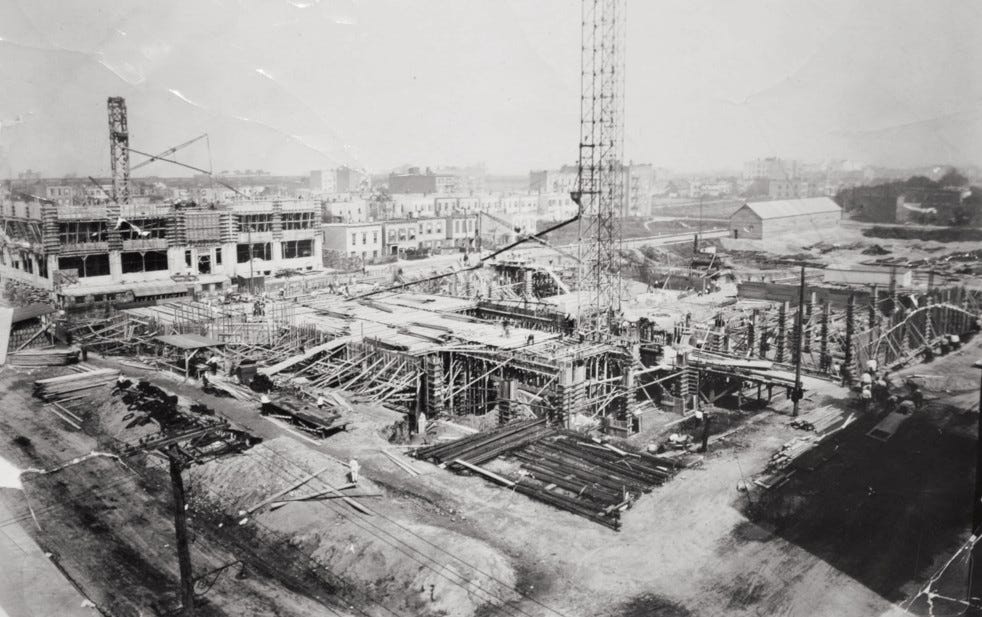The studio building occupied most of the larger site, fronting on Pierce Avenue, with the balance of the lot kept available for the construction of exterior sets. It was designed by the Fleischmann Construction Company to accommodate twenty production units working simultaneously. The main stage was an enormous interior space measuring 120x218 feet, with a height of 50 feet, enclosed by three stories of shops, offices, and dressing rooms. The original plans called for this area to be covered by a great glass vault, «to provide natural daylight so as to make it possible to take scenes practically from sunrise to sunset without artificial light.» Given the scale of the new studio, this was a completely impractical notion, and during construction the glass roof was eliminated, to be replaced by a revolutionary system of studio lighting first used a few months earlier during the renovation of the Amsterdam Opera House.